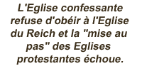 Mais les exigences des » Chrétiens allemands » se faisant toujours plus pressantes (on exige par exemple jusqu’au rejet de l’Ancien Testament considéré comme » trop juif « ), des divisions surviennent au sein même des » Chrétiens allemands » et de nombreux fidèles quittent le mouvement en novembre 1933. Face à cette » Eglise du Reich « , Eglise officielle soumise aux autorités national-socialistes, se constitue un mouvement de résistance qui donnera naissance à l’Eglise confessante. Celle-ci se comprendra comme la » véritable Eglise protestante » en Allemagne et se fonde sur un » droit ecclésial de crise » (Kirchliches Notrecht). Elle refuse la politique de la » mise au pas » du régime nazi, ainsi que » la falsification de la doctrine chrétienne par l’idéologie raciste du national-socialisme « . C’est parce que les membres de l’Eglise confessante refusent leur obéissance à l’Eglise du Reich et à son évêque Ludwig Müller, que la » mise au pas » complète des Eglises protestantes va échouer.
