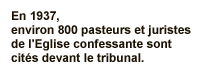La persécution de l’Eglise confessante et de ses membres se renforce au moment où, en août 1936, est publié un texte anonyme de mise en garde contre Hitler, dénonçant la terreur de la Gestapo, l’existence des camps de concentration et rejetant la vision du monde national-socialiste et l’antisémitisme de l’Etat. Le régime nazi répond par une vague d’arrestations. En 1937, environ 800 pasteurs et juristes de l’Eglise confessante sont cités devant le tribunal.