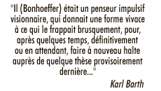 Bonhoeffer n’est pas un théologien de cabinet. Sa théologie se construit au contact des autres, dans la discussion avec ses étudiants, dans la lecture, mais aussi, et de plus en plus, au contact de la situation politique, au contact du monde qui l’entoure. Il parlera dans son ouvrage